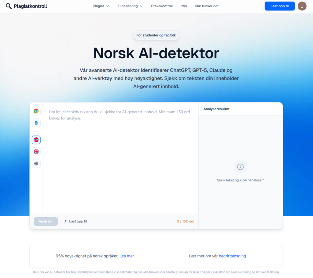 For lesere som primært jobber på norsk og vil ha et verktøy tilpasset lokale formuleringer og akademisk praksis, er det verdt å teste en dedikert løsning. Plagiatkontroll.no fremhever blant annet en egen norsk-trent AI-modell med 95 % nøyaktighet i sine materialer – tall du bør tolke som leverandørens egen dokumentasjon, ikke som uavhengig garanti, men som indikasjon på at leverandøren satser tungt på presisjon for norsk marked.